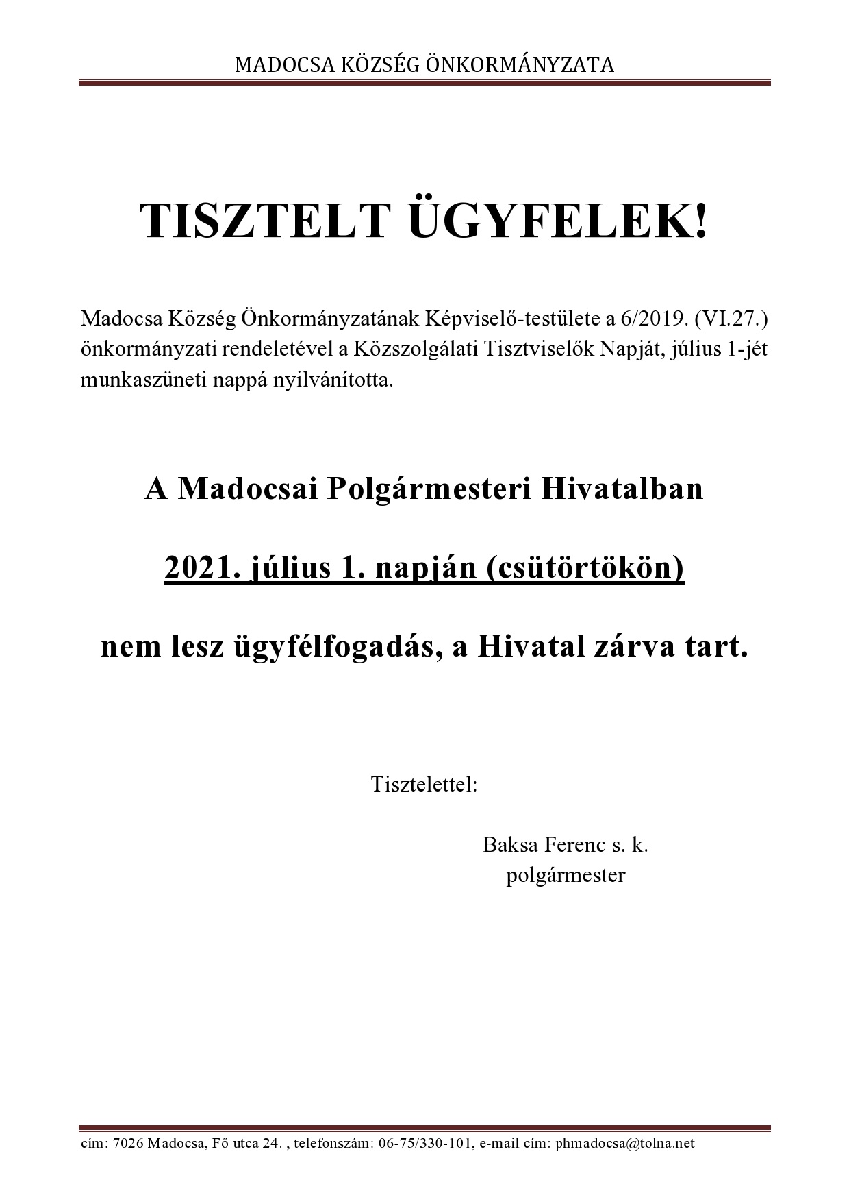 Lakossági Tájékoztatás- 2021.07.01. munkaszüneti nap a Polgármesteri Hivatalban 2021.06.28. by ifjusagihaz in Hír, tájékoztató Tetszik? Ossza meg másokkal is!