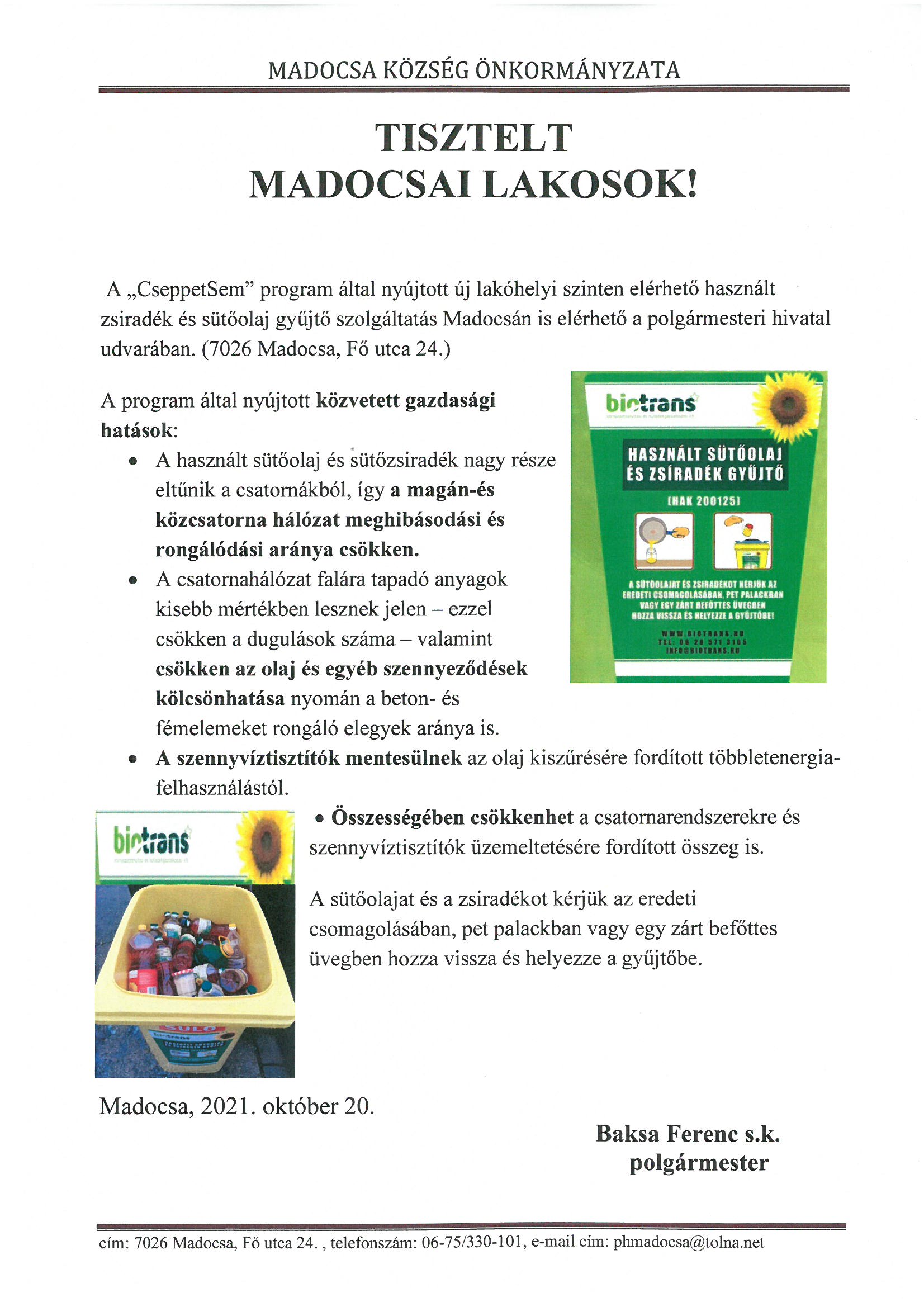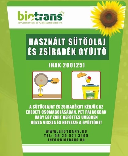 Lakossági Tájékoztató – Használt sütőolaj és zsiradék gyűjtés 2021.10.20. by szerkeszto in Hír, tájékoztató Tetszik? Ossza meg másokkal is!
