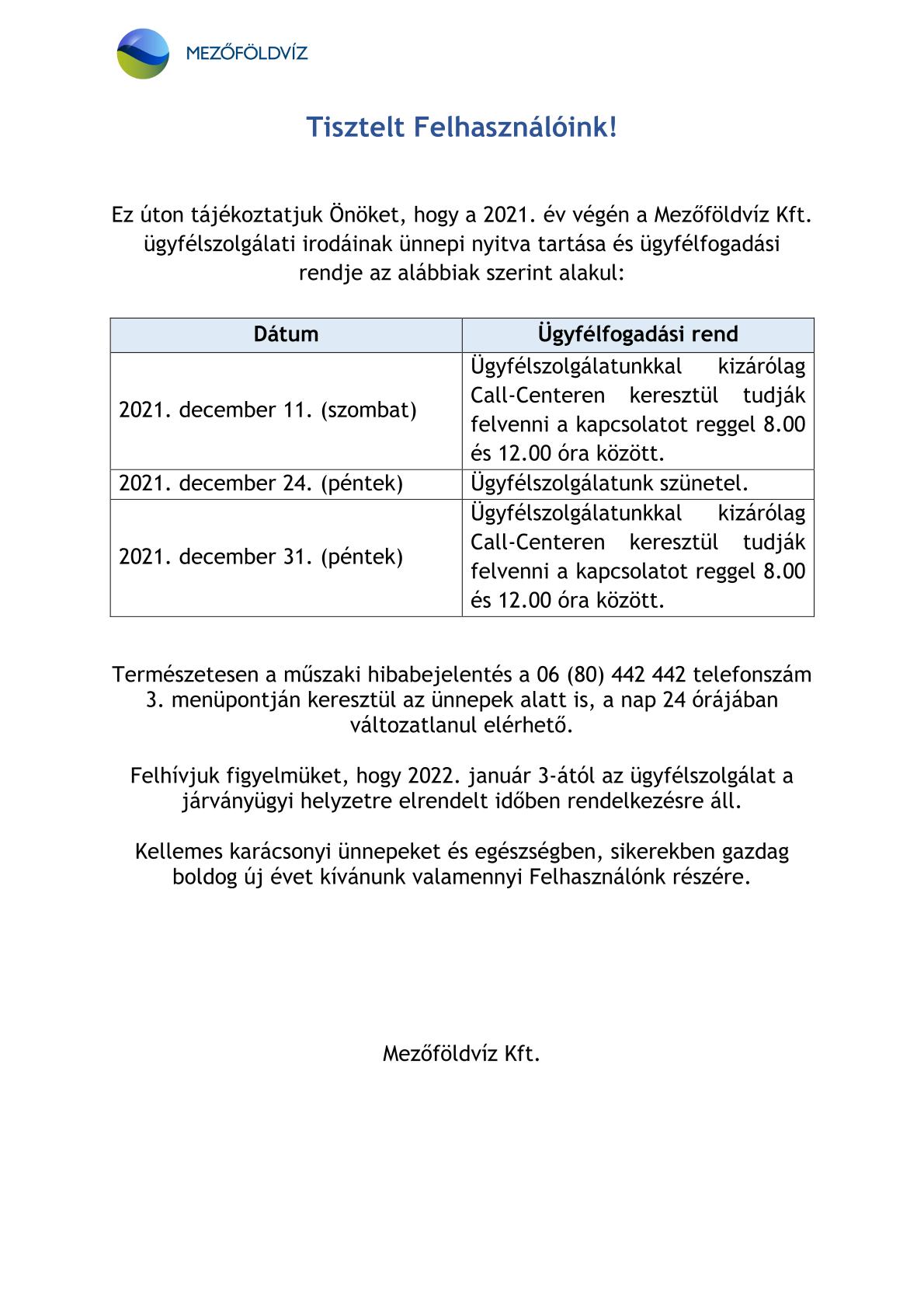 Lakossági Tájékoztató – Mezőföldvíz Kft. ügyfélszolgálati nyitva tartása 2021.12.02. by szerkeszto in Hír, tájékoztató Tetszik? Ossza meg másokkal is!