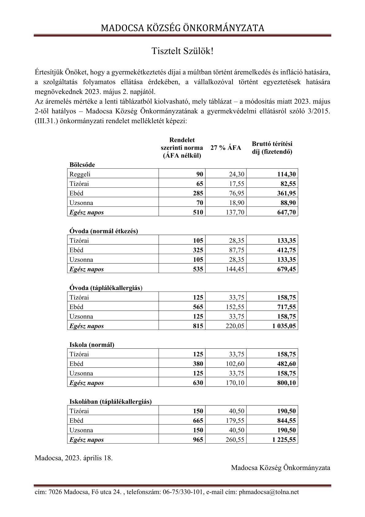 Tájékoztatás – Térítési díj emelésről 2023.04.18. by szerkeszto in Egyéb kategória, Hír, tájékoztató Tetszik? Ossza meg másokkal is!