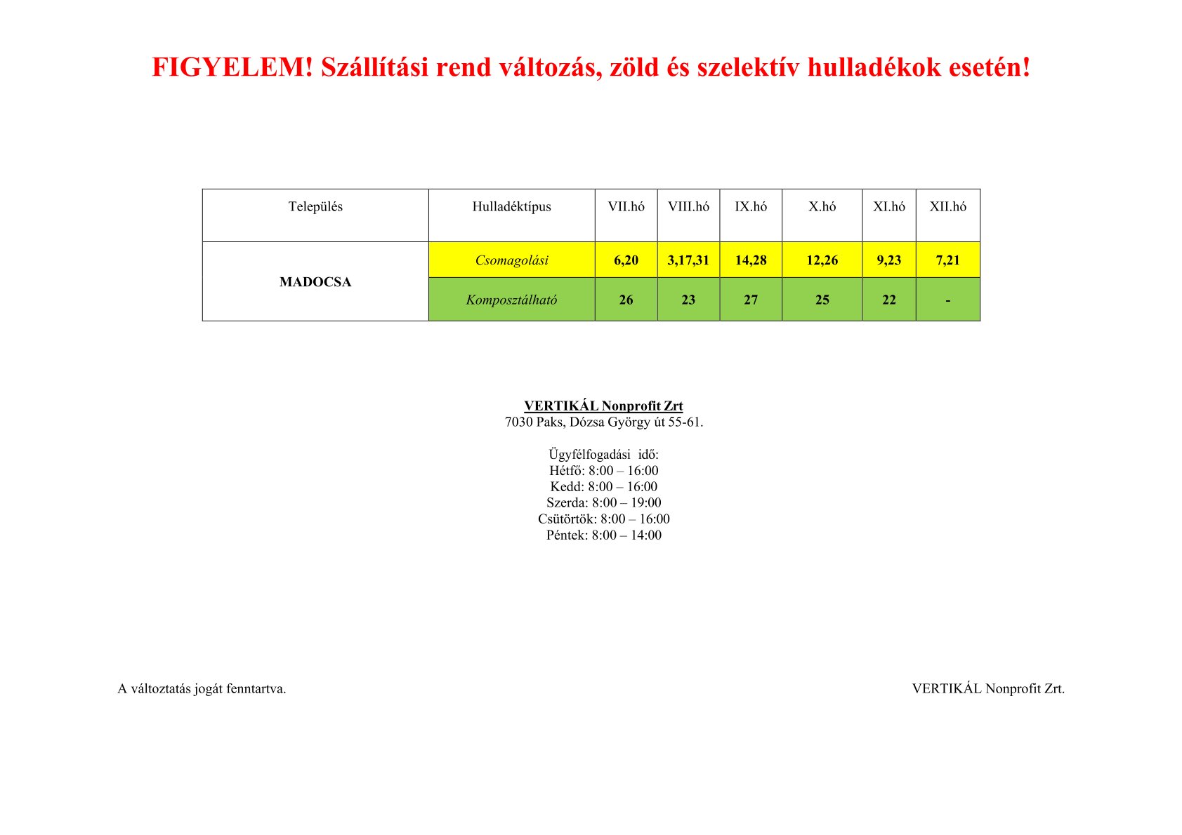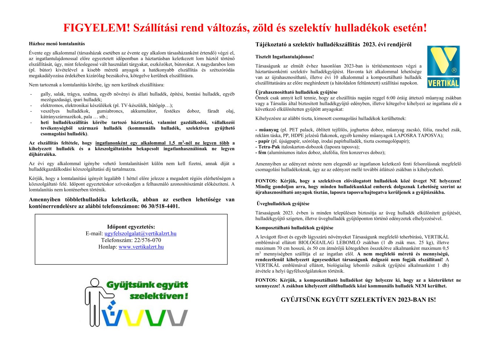 Tájékoztatás – Szállítási rend változás, zöld és szelektív hulladékok esetén!