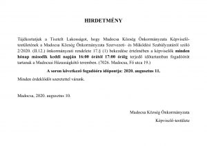 – Képviselő-testülete 2020. augusztus 6-án (csütörtök) 15:30 órai kezdettel munkaterv szerinti nyílt ülést tart.